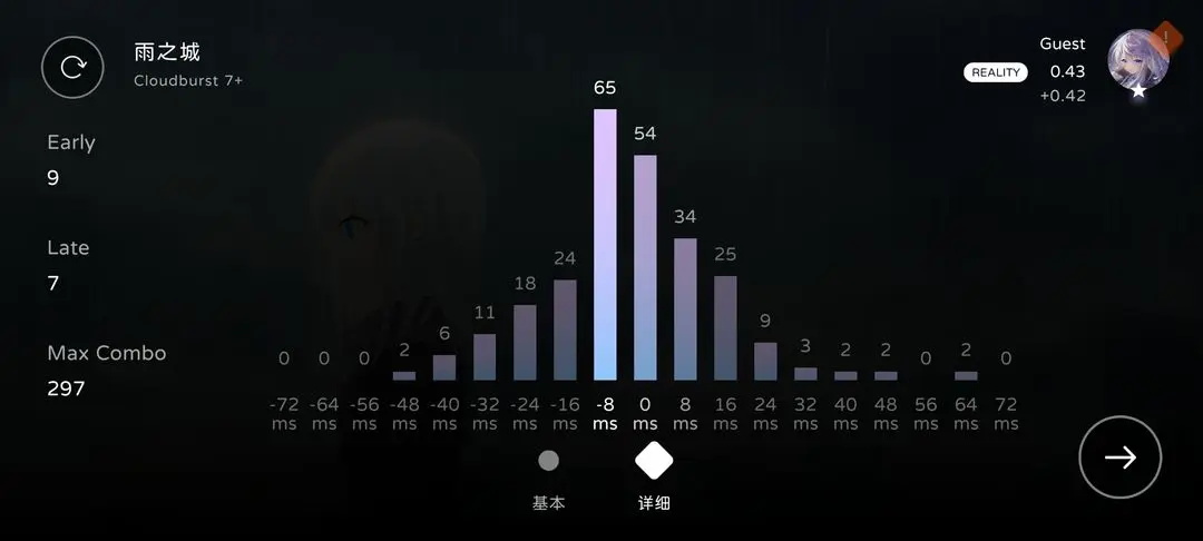 此外,由于每位玩家的设备性能,个人抓拍习惯,流速等原因,偏移并不一定就适合自己,因此需要根据游玩具体情况再次进行调整。选择一首自己可以轻易获得高分的谱面进行游玩,然后选择下面的详细,可以查看判定分布图。