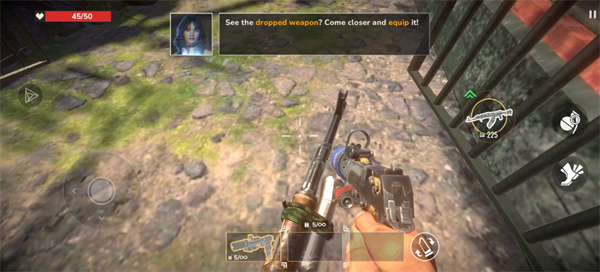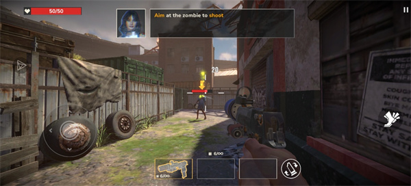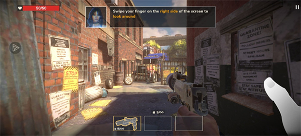 视角控制:按照引导滑动屏幕右侧调整视角,时刻扫描周围环境,避免被背后偷袭的僵尸包围。