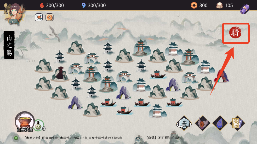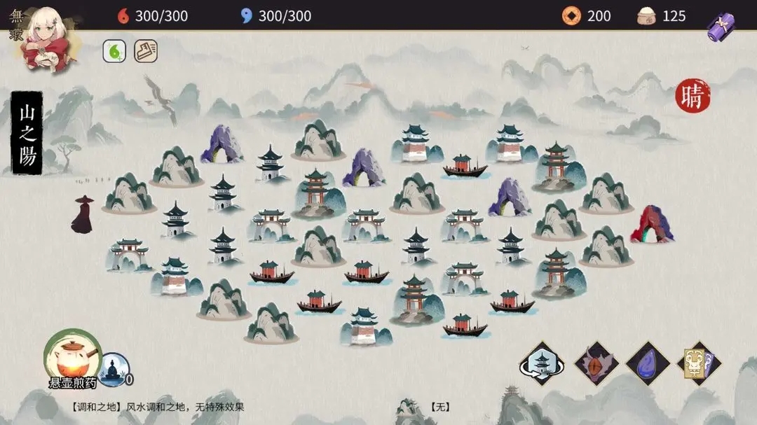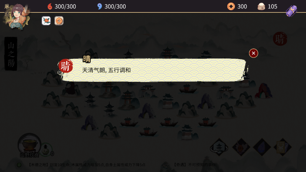 每局游戏的地图自然是随机生成的。不同的区格有对应的风水,天气也会随着游戏的进行变化。不同的风水与天气,都会带给主角带来不一样的影响。
