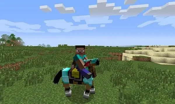 4、这个时候给马穿上马鞍和马铠,这样这个马就是我们的了,我们可以骑着它去飞奔。