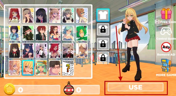 2、接着进入到角色选择界面,选择你喜欢的角色后,点击屏幕右下角的USE进行使用。