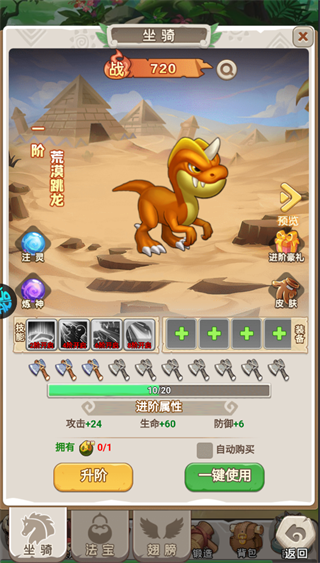 坐骑可通过升阶显著提升攻击、生命与防御属性,并解锁专属技能;同时支持注灵、炼神及皮肤更换等多维养成方式,全面强化角色战力。