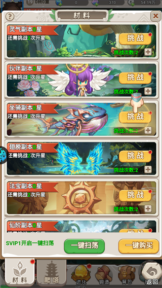 每日开放的材料副本涵盖灵气、伙伴、坐骑、翅膀等全品类养成资源,稳定提供升星所需材料;SVIP用户更可启用一键扫荡,高效刷本省时省力。