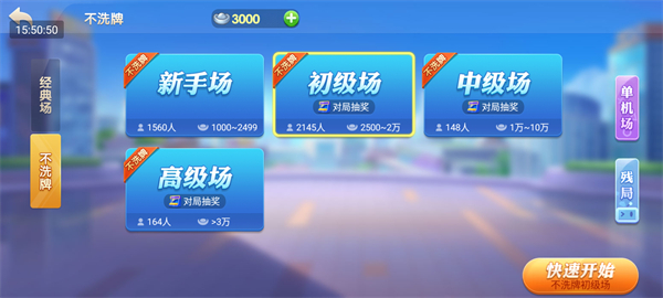 在不洗牌等玩法中,可根据当前银两数量选择新手场、初级场、中级场或高级场,循序渐进提升牌技。
