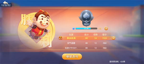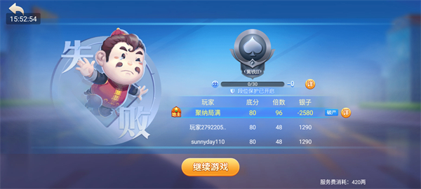 每局结束后,系统将展示胜负结果、底分、倍数、银两收益及段位积分变化,点击“继续游戏”即可快速开启下一局。