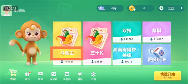 主界面提供多种热门牌类玩法入口,如斗地主、五十K等,点击即可进入对应专区,自由选择心仪模式。