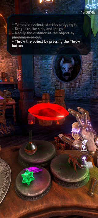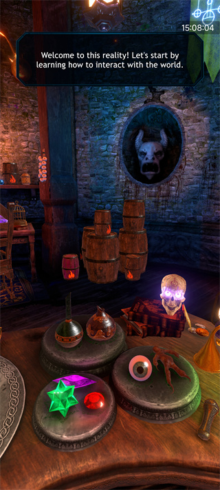 将绿色星形宝石、红色宝石、眼球等神秘材料投入燃烧的坩埚,通过倾倒动作触发炼药反应。成功后即可解锁对应魔法效果。每一种材料组合都可能诞生全新法术,是探索魔法体系的核心途径。