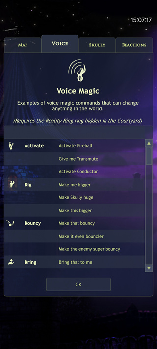解锁语音魔法后,玩家可直接输入指令如“Activate Fireball”(激活火球术)或“Make me bigger”(让我变大),无需复杂手势即可释放强力法术。该能力还可用于修改物品属性、召唤战斗单位,是后期探索庭院与地牢不可或缺的核心技能。