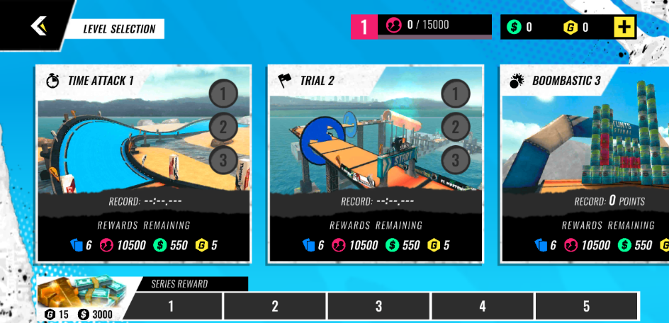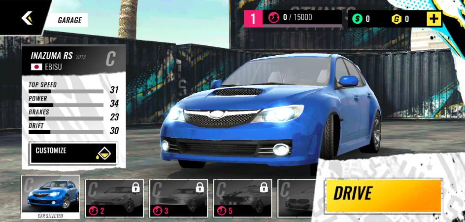 2. 进入车库可解锁不同等级的赛车(分为C、B、A、S四个级别),初始阶段因资金有限仅有一辆基础车型可用。设置完成后,点击右下角黄色按钮返回主界面,选择心仪模式(例如职业模式)开始挑战;