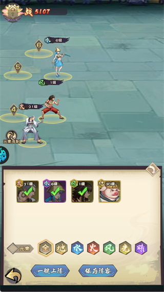游戏采用火、水、风、地四大元素克制机制,玩家可自由搭配上阵英雄,并灵活调整站位,打造专属战斗阵容,以智取胜。