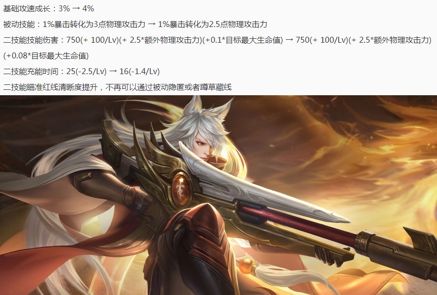 百里守约削弱:成长攻速增高,暴击收益降低,2技能伤害降低,2技能CD减少,瞄准线不可隐藏且特效更明显。