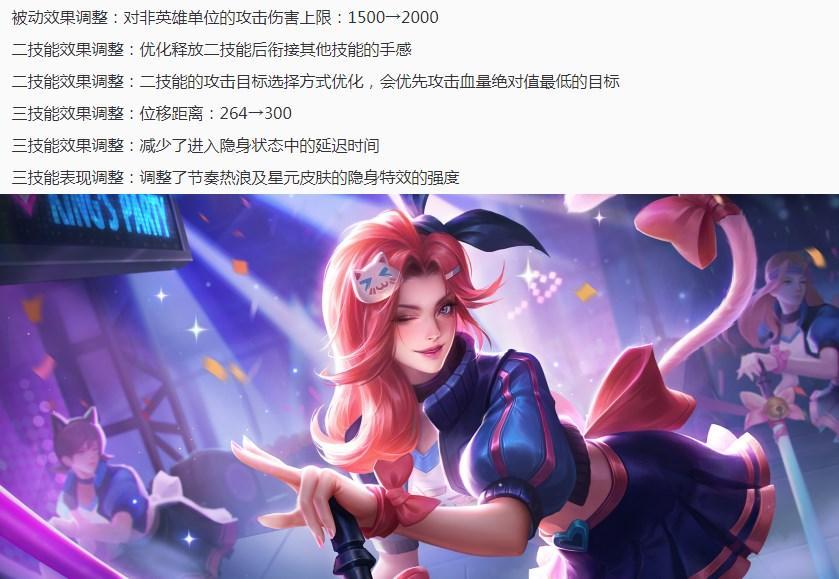 阿轲加强:可对野怪造成更高伤害,优化2技能连招手感,大招进入隐身时的延迟时间缩短,且位移距离更远。而节奏热浪由于隐身不够明显,在本次更新后隐身特效会更显眼。