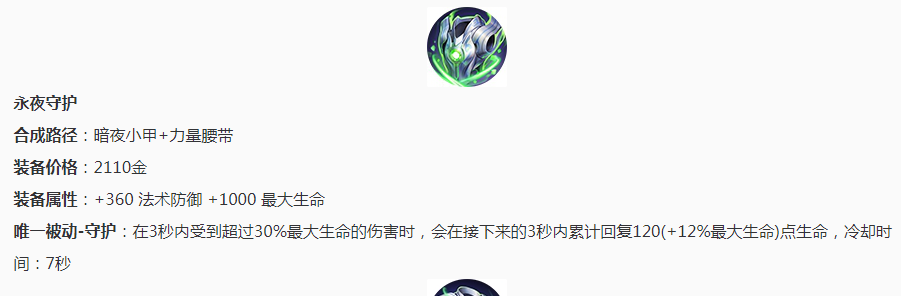永夜守护:属性+法抗+血量,受到大量伤害时,会持续回复百分比生命值。