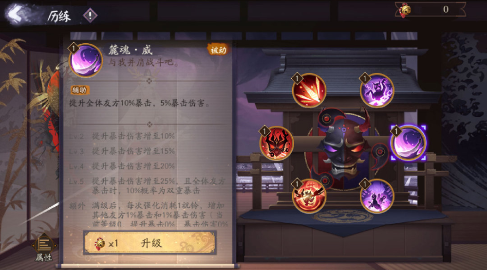 首先需要注意的是,这个活动咱们阴阳师的位置又要被其他式神替换,这次就是铃鹿御前代替了原本的阴阳师铃鹿御前有一个技能升级界面面,建议大家升级铃鹿御前的二技能和五技能,二技能是铃鹿御前攻击敌方造成伤害后,提升队友15%的伤害,持续3回合,升满级的话是提升30%的伤害,越高对队友的增益越大;5技能是提升队友的暴击和暴击伤害,升满级之后,队友的御魂更加好做。