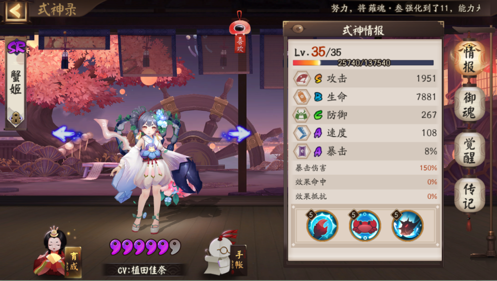 体验服的玩家是在喂铃鹿御前的五技能的时候,喂到蟹姬可以打残敌人又不至于打死的地步就不喂了。也可以反过来,铃鹿御前先喂技能,喂了满了之后再调整蟹姬的御魂,然后之后就不再喂技能了。