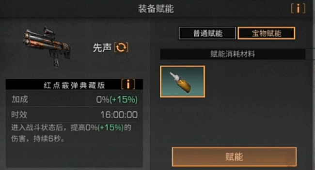 什么是最大赋能效果呢?这里以红点霰弹枪为例,先用纳米塑料I赋能先声,封顶能提升10%伤害,接着再在10%的基础上使用LV1火器燃油,伤害则从10%升至11%,即在原最大伤害的基础上又提升了10%伤害。
