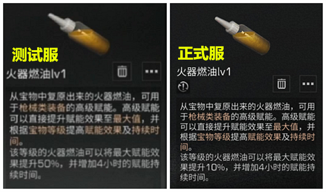 如上图所示,这是测试服的时候,LV1火器燃油能可以将最大赋能效果提升50%,并增加4小时的赋能持续时间;而到了正式服,在条件不变的情况下,赋能效果从50%降至10%,低级赋能效果足足削了5倍!