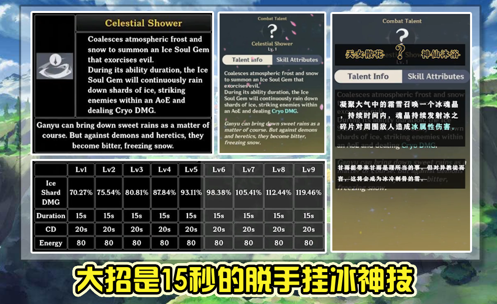 但是甘雨大招召唤出来的冰晶打击,持续时间足足有15秒,CD是20秒,简直就是脱手挂冰神技啊!