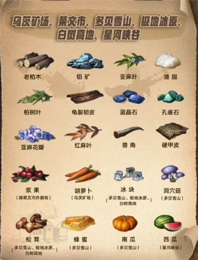 Tips:地图资源可以通过点击地图左上角,查看当前地图的特产,