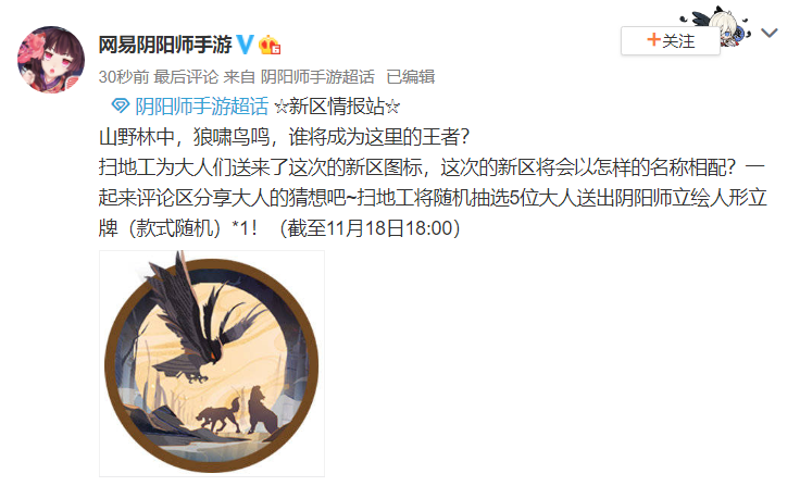 这是官方在社交平台上对外发布的一则公告,本质上是征集网友们的创意,为游戏新区取名。而不出意外的话,此次开设新区依托的背景便是全新式神的推出。根据官方公告里发布的相关信息来看,基本上能够得出几条有用的信息点,可以进一步的推敲一下。