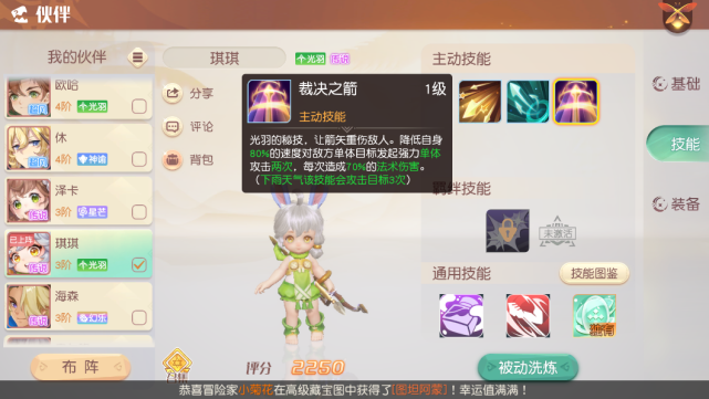 羁绊方面,琪琪的唯一一个羁绊是和超凡级光羽——欧哈(可能这就是萌物互相吸引?)的羁绊,强化裁决之箭的输出效果,羁绊效果简单粗暴,但是受限于欧哈仅仅只是一个超凡级伙伴,并且同样是光羽位置重叠,使得这个羁绊基本上就是个废羁绊了。