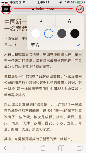 在阅读界面中,我们点击左上角圆圈内的图标,点击右侧【AA】图标,就能够对阅读界面进行设置,比如调底纹颜色、字体大小、字型等。再点击一下左上角图标,就恢复到原网页了。
