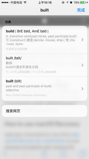 在阅读英文网页的时候,小编水平有限,经常会碰到不认识的单词。使用Safari浏览器的时候,省去了复制单词去软件上查找的过程。长按单词,点击【查询】,就可以看到这个单词的意思,点击【搜索网页】就可以查看这个单词的搜索结果。