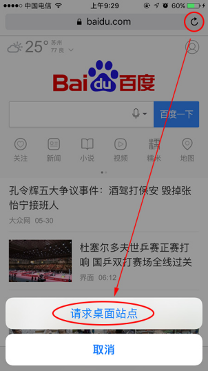 有些手机端的页面浏览体验并不是很好,这时候我们就想要将页面切换成电脑版页面。我们如何快速操作进行切换呢?在Safari浏览器的搜索栏右侧有一个刷新按钮,我们长按刷新按钮,选择【请求桌面站点】即可完成切换。