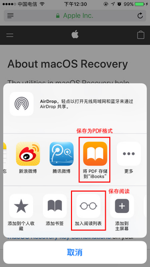 当我们看到好的文章,来不及看完想要保存网页继续查看,或是想要以PDF格式保存到手机上时。我们点击网页底部最中间的分享按钮,点击【加入阅读列表】就能保存网页了(阅读列表在分享按钮右侧的书签图标里可以查看)。点击【将PDF存储到“iBooks”】,就能将网页以PDF格式保存到手机上,在手机的【iBooks】应用中可以查看。