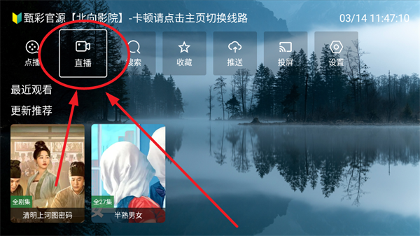 2、进入首页点击“直播”进入电视直播页面。