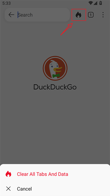 3、点击顶部的搜索栏,我们可以进行上网搜索。搜索栏右边的火苗图标(红框选中的部分)是一键烧毁功能,可以把我们的标签和上网数据烧毁