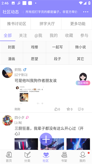 2、点击下方社区可以和书友和创作者们讨论小说和各种有趣的事物。