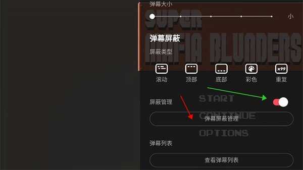 在右侧弹出的弹幕设置页面中,开启弹幕屏幕管理下图绿色箭头所指,并点击弹幕屏蔽管理下图红色箭头所指