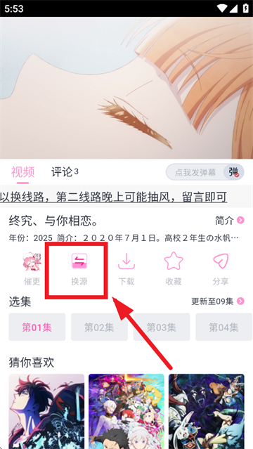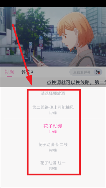下载安装并打开花子动漫app,进入自己想看的动漫页面,点击换源
