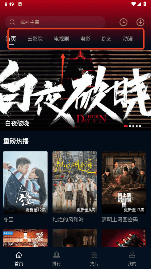 进入双鱼视频app之后,可以看到云影院、电视剧、电影、综艺、动漫五大栏目;