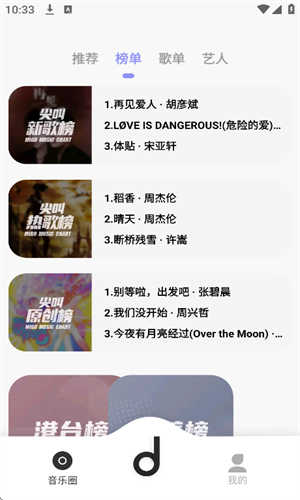 3、用户们可以选择榜单、歌单和艺人等分类来听歌,所有的歌曲都是免费的哟;