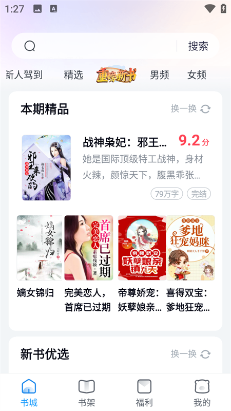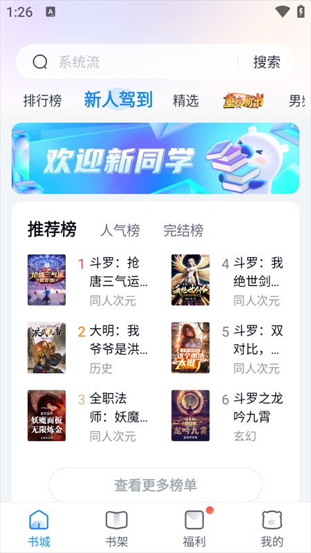 1、在软件首页,我们能够看到一系列小说推荐榜、人气榜、完结榜,这样可以帮助我们找到一系列宝藏小说。