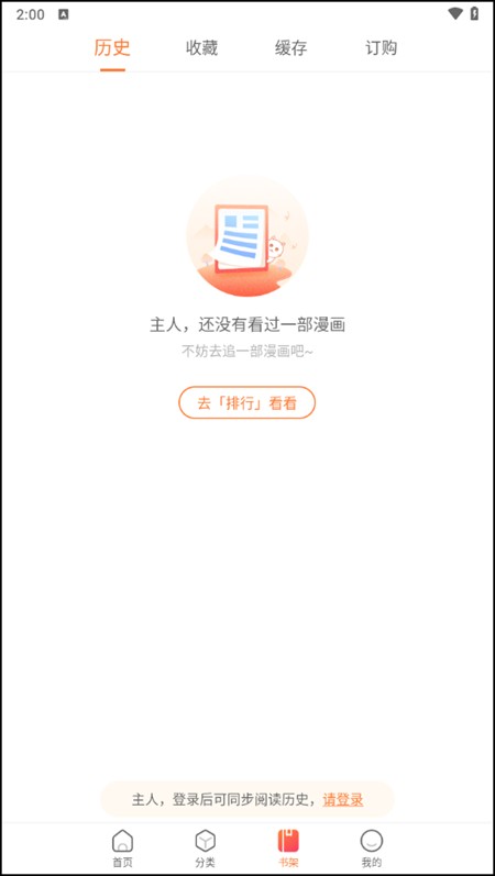 3、在书架界面下,我们能够查看历史、收藏、缓存、订购等一系列板块内容。