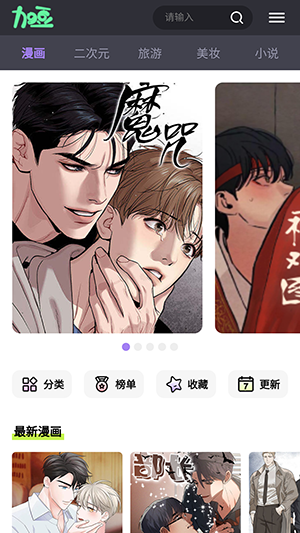 2、加豆漫画软件界面简洁、清新,收集了大量优质阅读资源。