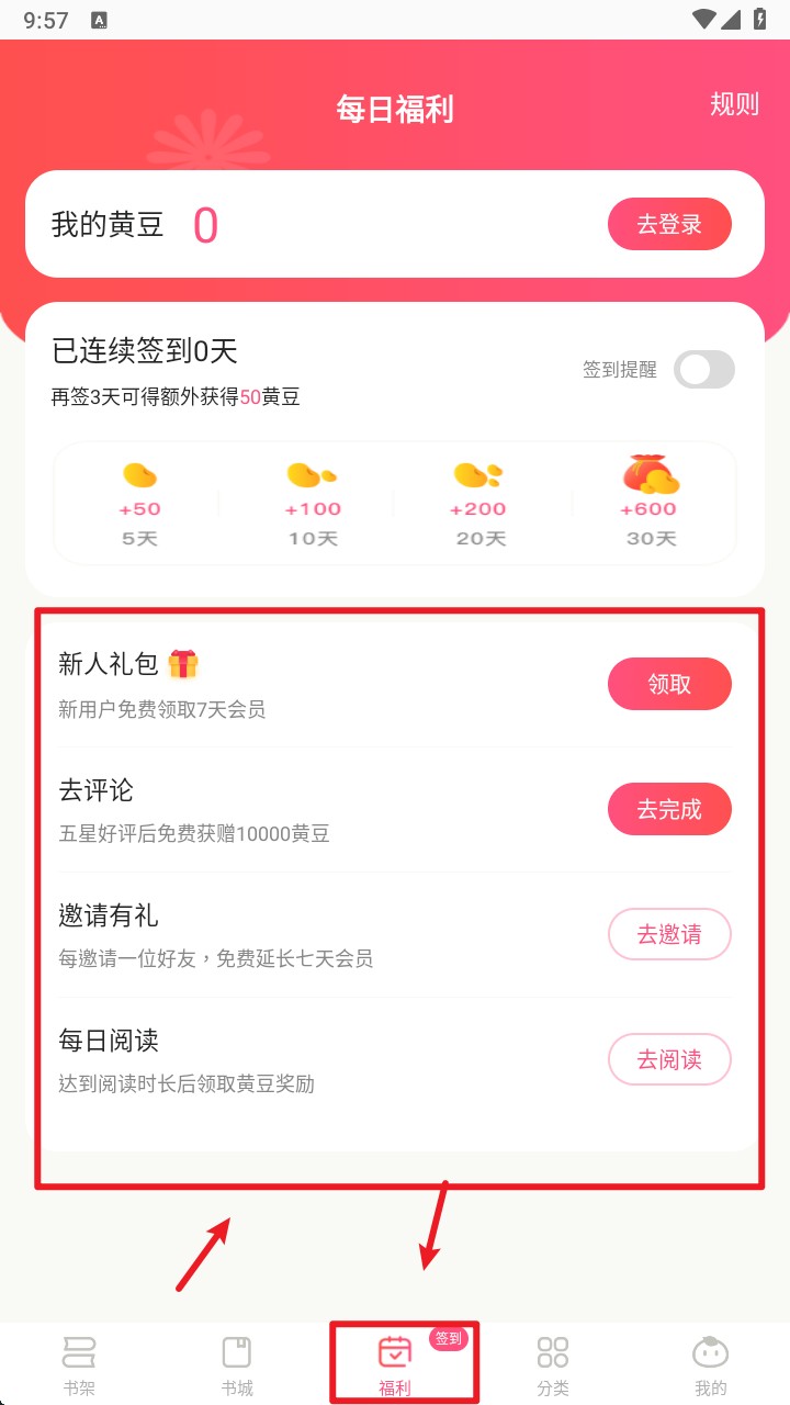 4. 在「福利」页面可领取新人礼包、签到奖励、评价赠豆等福利任务。