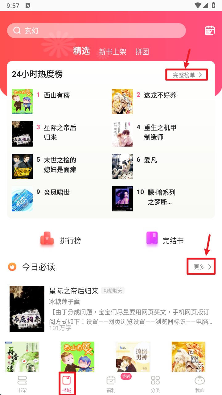 3. 返回底部导航点击「书城」,可查看热门榜单和最新上架小说,点选右上角查看更多内容。