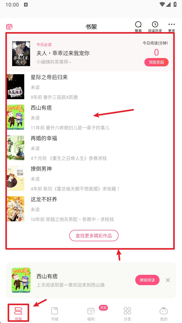 1、打开进入腐竹免费小说后,让我们点击底部导航栏中的「书架」,即可查看已收藏或正在阅读的小说列表。