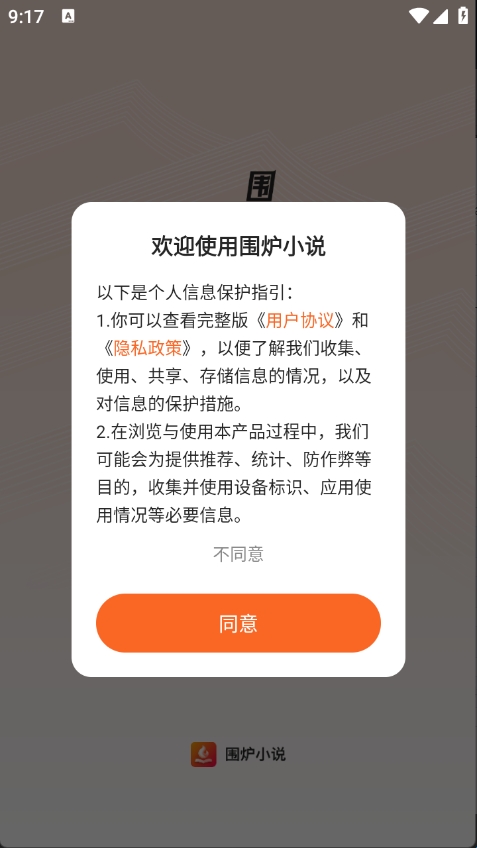 1、用户首先在本站下载围炉小说app,点击同意隐私政策与用户协议。
