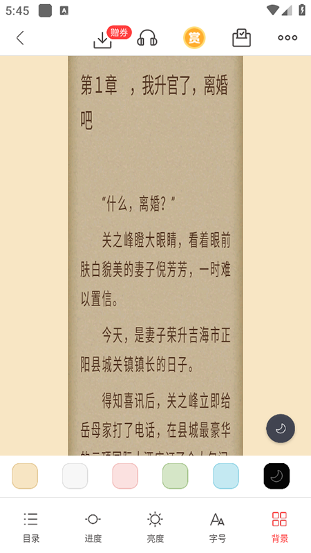 4.阅读界面可调整字体、背景颜色、亮度,开启护眼模式,优化阅读体验。