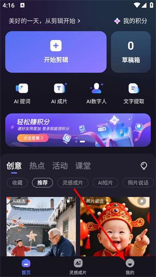 1、进入界面先看到美好的一天从剪辑开始字样,还有开始剪辑按钮,以及数字人文字提取等功能选项,可选择开始剪辑开启操作。