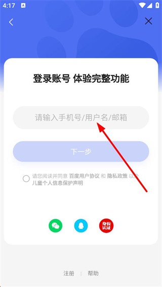 4、进入登录账号体验完整功能界面,有请输入手机号用户名邮箱输入框,还有下一步按钮,下方有相关协议提示,可选择方式输入信息继续流程。