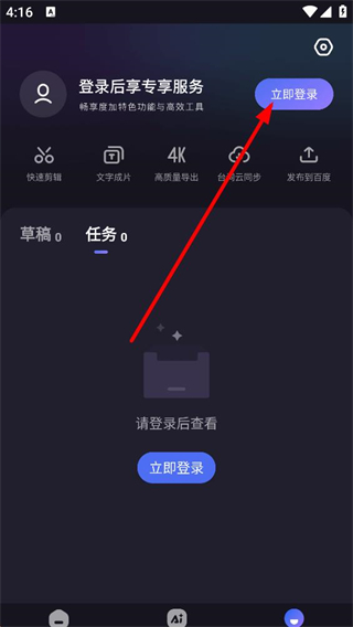 2、点击我的进入对应界面,看到登录后享专享服务提示,还有立即登录按钮,以及快速剪辑文字成片高质量导出等功能选项,准备进行登录操作。