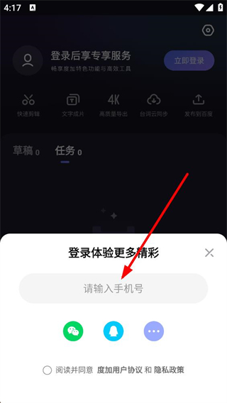 3、点击立即登录后弹出登录体验更多精彩窗口,有请输入手机号输入框,还有微信等登录选项,需先勾选阅读并同意度加用户协议和隐私政策。
