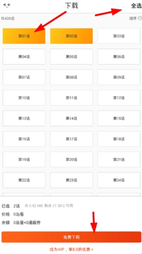 3、如此一来,用户们选中自己感兴趣的漫画集数后,就可以通过下方的按钮完成下载缓存,非常的方便快捷!