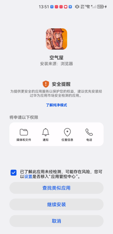3、第三步,点击勾选“已了解此应用未经检测……”,然后再点击“继续安装”。(出现安全提醒,不用惊慌)